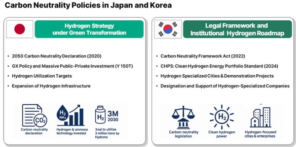 수소와 암모니아는 대표적인 탄소중립 에너지원으로 각광받고 있다. 수소는 그린수소 생산기술과 연료전지 기반 발전 및 모빌리티 분야에서 주목받고 있으며, 암모니아는 석탄·가스 발전과의 혼소 (co-firing) 기술을 통해 기존 에너지 인프라의 저탄소 전환 수단으로 활용되고 있다.